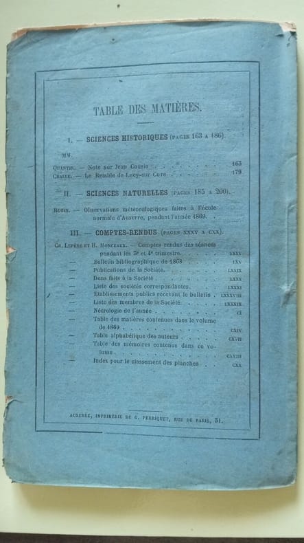 Table : Georges MICHEL : In mémoriam Daniel Prost (1950-1990). Pascal LAURENT : le sanctuaire de source gallo-romain d'Escolives-Sainte-Camille. - Jean Paul DESAIVE : D'Auxerre à Paris et retour : un témoignage inédit de 1644. - Bernard MOREAU : Les comptes de Jean-Joseph Languet de Gergy, archevêque de Sens, pour l'année 1741. - René et Suzanne PELISSIER : La ferme des pauvres à Villeneuve-les-Genêts. - Francine ROLLEY : Les cahiers de doléances du bailliage d'Avallon. - René et Suzanne PELISSIER : Les prénoms révolutionnaires à Mézilles. - Norbert DONZEAUD : quelques aspects du monde paysan au lendemain des guerres de la Révolution et de l'Empire. Robert BREUILLER : A Rienharz (Bade-Wurtembert) de 1940 à 1945. - Antoine DEMEAUX : henri Brochet, peintre et dramaturge auxerrois. Pierre HAASE : Les perches, méthode auxerroise originale pour l'échachalassement des vignes. - Annie GAUTHEY : Contribution à l'étude des chiroptères dans l'Yonne. Hervé CHEVRIER : Catalogue des imprimés provenant des archives de la Société des Sciences historiques et naturelles de l'Yonne. - Jacques MOMOT : Note : analyse chimique d'ossements humains datant du VIIe siècle. - Maris NOEL : Marie Noël et le cru d'Auxerre : Lettres inédites à Suzanne Coutant, à François Talva ; article de Lucien Descaves : "la passion ingénue". Rayonnement de l'oeuvre par Georges MICHEL.