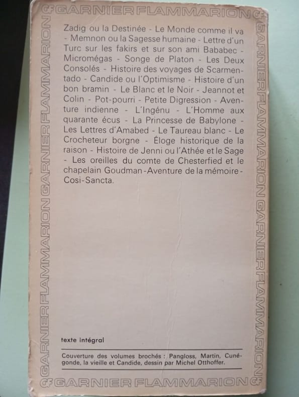 NRF / Gallimard / Pléiade Paris, 1979, in-12 reliure éditeur sous rhodoïd et jaquette illustrée. (pas de boitier carton). Introduction par Frédéric Deloffre. Notices par Jacques Van Den Heuvel. LXXIV-1316pp.-1f. De tables. Comprend : Le Crocheteur borgne - Cosi Sancta - Songe de Platon - Micromégas - Le Monde comme il va - Zadig ou la destinée - Memnon ou la Sagesse humaine - Lettre d'un Turc - Histoire des voyages de Scarmentado - Les Deux Consoles - Candide ou l'optimisme - Histoire d'un bon bramin - Pot pourri - Le Blanc et le Noir - Jeannot et Colin - aventure indienne - L'Ingénu - La Princesse de Babylone - L'Homme aux quarante écus - Les Lettres d'Amabed - Le Taureau blanc - Aventure de la mémoire - Éloge historique de la Raison - Les Oreilles du comte de Chesterfield et le chapelain Goudman - Histoire de Jenni ou le Sage et l'athée. Très bon état.