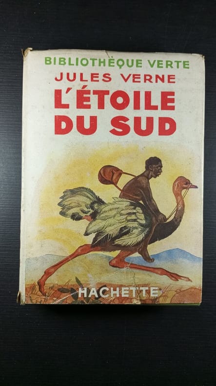 Édition originale illustrée, cartonnage Hetzel, volume simple dit ''aux initiales J.V. J.H.'' (270x180mm) dans une percaline rouge, titres dorés au dos, plaque dorée de Berger composée de 3 médaillons avec le titre doré au centre, toutes tranches dorées, frontispice sous serpente et vignette de Benett, 242 pages, 1f table des matières, catalogue CH (4ff). Reliure de Charles Magnier (1821-1904). Accompagné de 60 dessins de Léon Benett (pseudo de Hippolyte-Léon Benet, 1839-1917) gravés par Méaulle, Dutertre, Müller.. et d'une carte (p128). Illustrateur de près de 25 des Voyages Extraordinaires, Léon Benett qui s'avoua lui-même admirateur de l'oeuvre de Jules Verne sut, aux dires de Jules Hetzel, ''dessiner avec vérité'' les tribulations des personnages verniens. L'Étoile du Sud paraît tout d'abord dans le Magazine d'Éducation et de Récréation en 1884 sous forme de feuilletons, puis la même année chez Hetzel en broché puis en cartonnage. Roman d'aventures rédigé par l'écrivain Paschal Grousset (1844-1909, journaliste) en 1880 et vendu à Hetzel sous le titre : L'Étoile du Sud, Aventures au pays des diamants puis remanié par Jules Verne. 34ème parution des romans et nouvelles des Voyages Extraordinaires publiés entre 1863 et 1919. L'histoire pourrait se résumer ainsi : un ingénieur des Mines cherche à obtenir la main d'Alice, la fille d'un riche diamantaire dans le Vaal en Afrique australe, et pour cela tente de fabriquer de toute pièce un diamant extraordinaire.. ''Parlez monsieur, je vous écoute. - Monsieur, j'ai l'honneur de vous demander la main de miss Watkins votre fille. - La main d'Alice ?''. Deux cahiers déréglés, dos lég insolé, bien complet, très bon état intérieur.