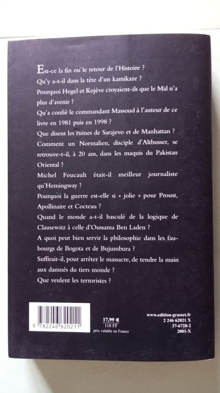 Grasset 2001 410 pages in8. 2001. broché jaquette. 410 pages. Est-ce la fin ou le retour de l'Histoire ? Qu'y a-t-il dans la tête d'un kamikaze ? Pourquoi Hegel et Kojève croyaient-ils que le Mal n'a plus d'avenir ? Qu'a confié le commandant Massoud à l'auteur de ce livre en 1981 puis en 1998 ? Que disent les ruines de Sarajevo et de Manhattan ? Comment un Normalien disciple d'Althusser se retrouve-t-il à 20 ans dans les maquis du Pakistan Oriental ? Michel Foucault était-il meilleur journaliste qu'Hemingway ? Pourquoi la guerre est-elle si jolie pour Proust Apollinaire et Cocteau ? Quand le monde a-t-il basculé de la logique de Clausewitz à celle d'Oussama Ben Laden ? A quoi peut bien servir la philosophie dans les faubourgs de Bogota et de Bujumbura ? Suffirait-il pour arrêter le massacre de tendre la main aux damnés du tiers monde ? Que veulent les terroristes