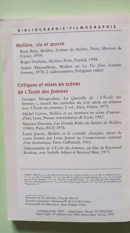 vie de moliere- l'etourdi - le depit amoureux- les precieuses ridicules- sganarelle- don garcie - l'ecole des maris, comedie en trois actes- l'ecole des femmes- l'impromptu de versailles- le mariage forcé- les facheux- la critique de l'ecole des femmes- la princesse d'elide- dom juan ou le festin de pierre- l'amour medecin - le misanthrope- le medecin malgres lui- melicerte- pastorale comique - le sicilien ou l'amour peintre- monsieur de pourceaugnac - les amants magnifiques- le bourgeois gentilhomme- les fourberies de scapin. Classification Dewey : 840.04-XVII ème siècle