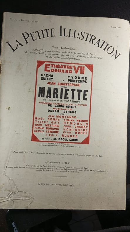 Sommaire : Mariette ou comment on écrit l'histoire, comédie en quatre actes par Sacha Guitry, musique de Oscar Straus, représentée pour la première fois, le 1er octobre 1928, sur la scène du théatre Edouard VII a Paris Classification Dewey : 70.4417-L'illustration / Figaro salon