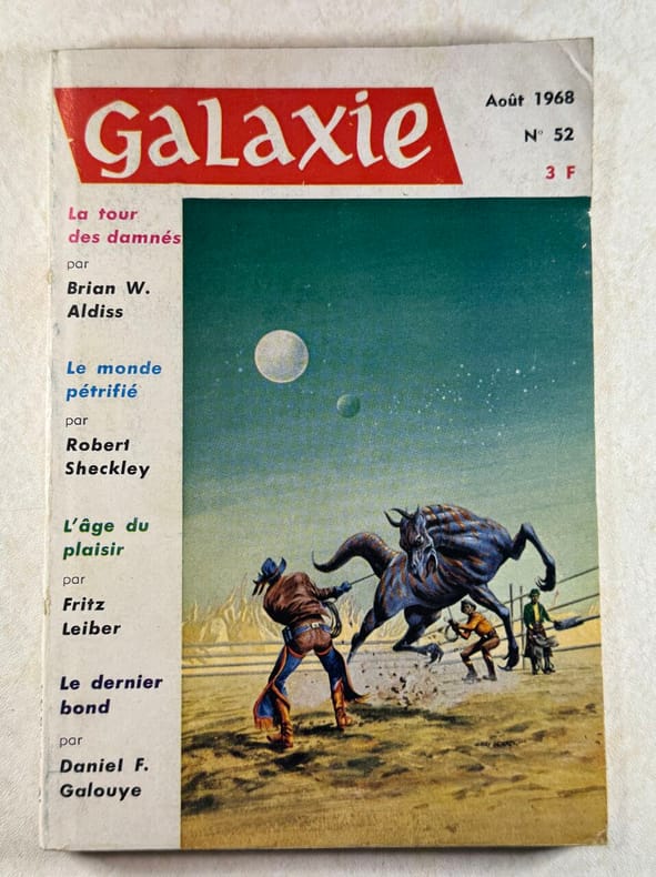 Galaxie anticipation - Science fiction. L'aventure dans l'anticipation. SOMMAIRE: l'age du plaisir (3) par frederik pohl, la tour des damnes par brian aldiss, le monde petrifie par robert sheckley, la gitane et le topologiste par h. hollis, cauchemar...cauchemar... par lafferty, le dernier bond par daniel galouye, sexe a piles et pannes de coeur par david bunch Classification Dewey : 70.49-Presse illustrée, magazines, revues