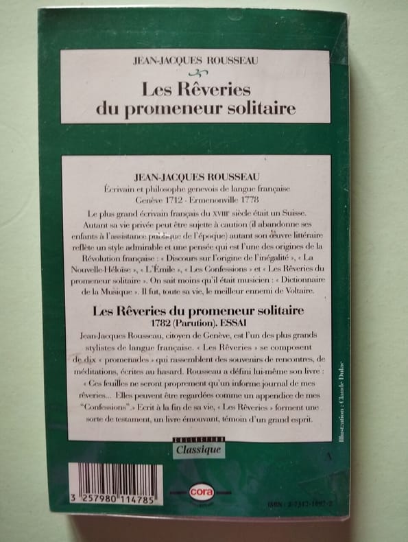 ÉDITIONS RENCONTRE LAUSANNE Sans date. Les Rêveries du promeneur solitaire est la dernière œuvre posthume et inachevée de Jean-Jacques Rousseau. Écrite dans les années précédant sa mort en 1778 elle se compose de dix méditations où l'auteur au fil de ses promenades mêle souvenirs réflexions philosophiques et confidences pour restituer les mouvements de son âme. L'ouvrage explore en particulier la tension entre son désir de solitude et son besoin de société