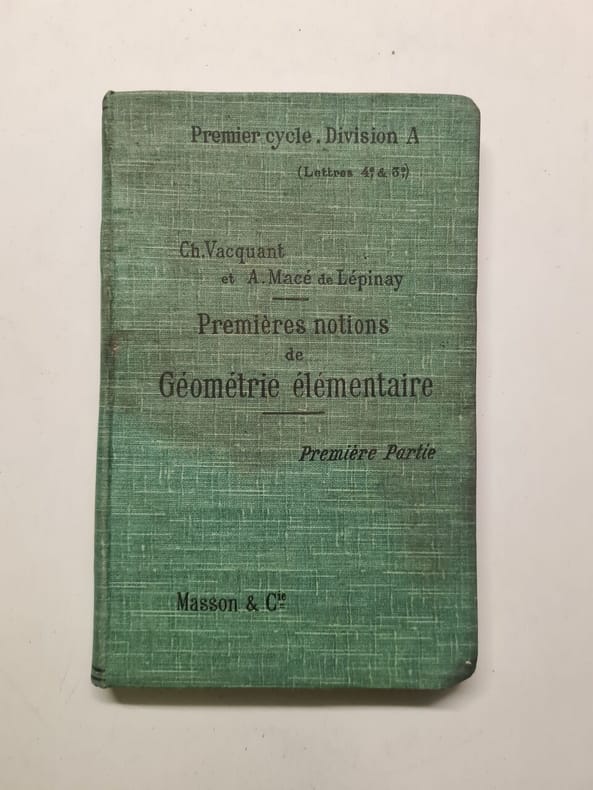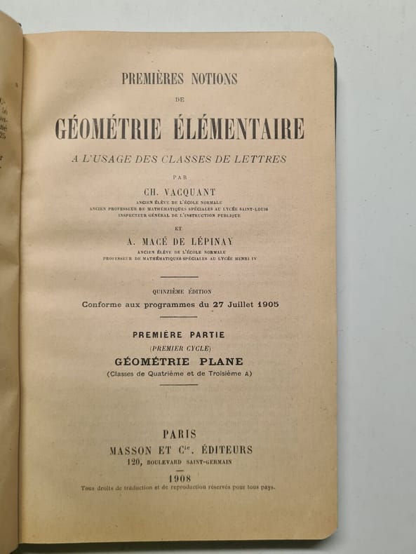 17 figures dans le texte en noir et blanc 3eme édition de la traduction française, 1931 "Contents, Chapitres : Texte, 96 pages - Introduction : Constructions théoriques et pratiques - Forme algébrique du problème - 1. Possibilité de la construction des expressions algébriques : Equations algébriques résolubles par radicaux carrés - Le problème de Delos et la trisection d'un angle quelconque - La division du cercle en parties égales - La construction du polygone régulier de 17 côtés - Généralités sur les constructions d'expressions algébriques - 2. Les nombres transcendants et la quadrature du cercle : Existence des nombres transcendants, démonstration de M. Cantor - Revue historique des essais de calcul et de construction de Pi - La transcendance du nombre ""e"" - La transcendance du nombre Pi - L'intégrale et la construction géométrique de Pi - Felix Christian Klein (25 avril 1849 à Düsseldorf 22 juin 1925 à Göttingen) est un mathématicien allemand, connu pour ses travaux en théorie des groupes, en géométrie non euclidienne, et en analyse. Il a aussi énoncé le très influent programme d'Erlangen, qui ramène l'étude des différentes géométries à celle de leurs groupes de symétrie respectifs. - La synthèse de Klein de la géométrie comme étude des invariants sous un groupe de transformations donné, connue sous le nom de programme d'Erlangen (1872), influença profondément l'évolution de la géométrie et des mathématiques dans leur ensemble. Ce programme était le cours inaugural de Klein comme professeur à Erlangen. Il propose une vision unifiée de la géométrie. Klein décrit en détail comment les propriétés centrales d'une géométrie donnée se traduisent par l'action d'un groupe de transformations. Aujourd'hui, cette vision est devenue tellement banale dans l'esprit des mathématiciens qu'il est difficile de juger de son importance, d'apprécier sa nouveauté et de comprendre l'opposition à laquelle elle a dû faire face. (source : Wikipedia)" couverture propre mais avec une trace de pliure sur le bas du plat inférieur, ainsi qu'une trace d'étiquette de prix au bas du même plat, traces de déchirures au dos, la couverture reste en bon état, l'intérieur est propre, papier jauni, signature de l'ancien propriétaire sur le haut de la premiere page, cela reste un bon exemplaire de la 3eme édition française de 1931 de ce texte fondamental de Félix Klein sur les constructions géométriques, cette édition chez Vuibert est devenue peu courante.