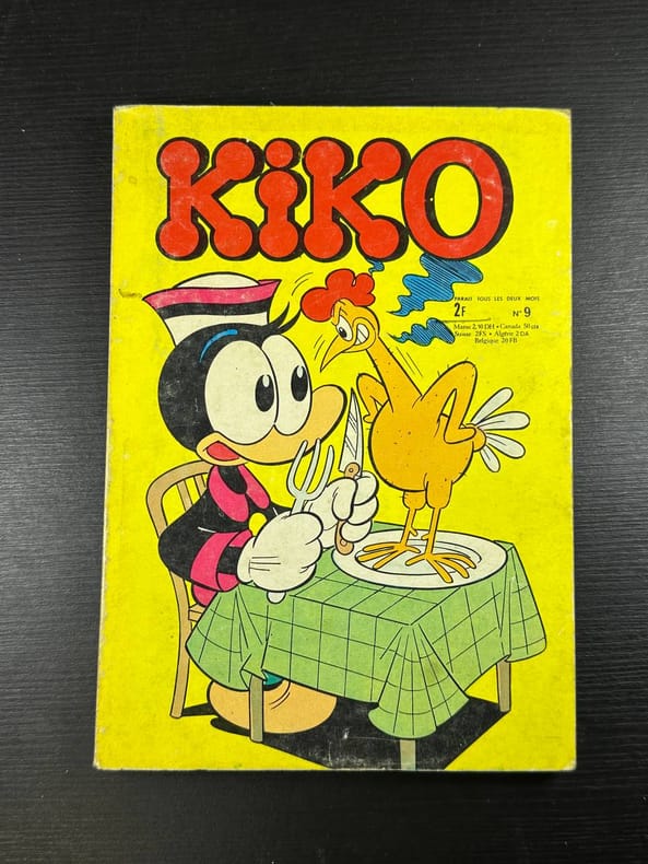 Editions Dupuis 1968. In-8 cartonnage éditeur de 55 pages au format 21,6 x 30 cm. Couvertures, pages de gardes, dessins et scénarios de Kiko. Dos pincé rond avec titre. Haut, bas du dos et coins avec infime tassement et frottis. Petits frottis au pelliculage, avec fente et décollement à celui du 1er plat. Intérieur assez frais. Assez bel état général pour cette rare édition originale, bien notée au 4ème plat D.1968/0089/22. Contient 3 histoires courtes. Edition originale. Exemplaire enrichi d'un magnifique dessin original, signé, de Kiko.