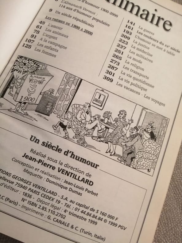 Un siècle républicain, l'argent, la guerre, les couleurs du XXéme siècle, 114 ans d'humour populaire, la vie politique, la religion.... Classification Dewey : 54-Almanach