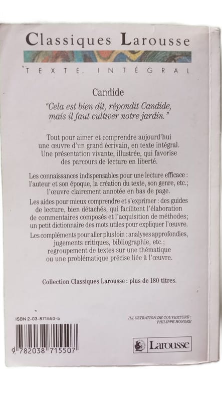 Larousse 2010 175 pages poche. 2010. Broché. 175 pages. Que signifie ce nom " Candide " innocence de celui qui ne connaît pas le mal ou illusion du naïf qui n'a pas fait l'expérience du monde ? Voltaire joue en 1759 après le tremblement de terre de Lisbonne sur ce double sens. II nous fait partager les épreuves fictives d'un jeune homme simple confronté aux leurres de l'optimisme mais qui n'entend pas désespérer et qui en vient à une sagesse finale mesurée et mystérieuse. Candide n'en a pas fini de nous inviter au gai savoir et à la réflexion. Avant d'aborder l'œuvre : fiche d'identité de l'auteur ; repères chronologiques ; fiche d'identité de l'œuvre ; l'œuvre dans son siècle ; lire Candide aujourd'hui. Pour approfondir : clefs de lecture ; genre action personnages ; l'œuvre : origines et prolongements ; l'œuvre : son courant ses tendances ; vers le bac : écrit oral ; outils de lecture ; bibliographie et filmographie