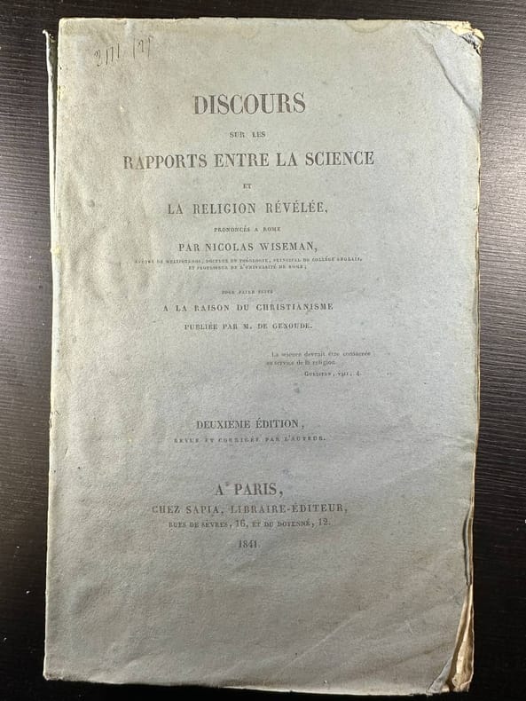 La première édition française est de 1837. L'originale anglaise (Twelve Lectures on the connexion between science and revealed religion, delivered in Rome) était parue à Londres en 1836.L'ouvrage se rattache à l'immense effort apologétique entrepris pour "concilier" les nouvelles découvertes sur les premiers temps de l'humanité tant avec les linéaments essentiels des récits bibliques que des doctrines considérées comme définitives par le magistère. De fait, les conférences reproduites dans l'ouvrage tournent-elles toutes autour des origines (étude comparative des langues ; débuts de l'humanité ; histoire primitive ; études orientales). À l'époque, le futur cardinal Wiseman (1802-1865), alors professeur de langues orientales à l’université de Rome, était reconnu comme un universitaire de premier plan, parlant six langues, et au fait de la plupart des débats d'actualité (scientifiques, artistiques ou relatifs à l’histoire de l'Antiquité). - - VENTE PAR CORRESPONDANCE UNIQUEMENT - LIEN DE PAIEMENT, NOUS CONSULTER.