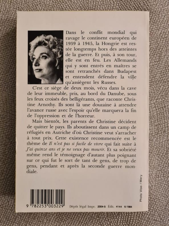 France Loisirs 1982 330 pages in8. 1982. cartonné sous jaquette. 330 pages. dans le conflit mondial qui ravage le continent européen de 1939 à 1945 la hongrie est restée longtemps hors des atteintes de la guerre. et puis à son tour elle est en feu. les allemands qui y sont entrés en maîtres se sont retranchés dans budapest et entendent défendre la ville qu'assiègent les russes. c'est ce siège de deux mois vécu dans la cave de leur immeuble pris au bord du danube sous les feux croisés des belligérants que raconte christine arnothy. ils sont là une douzaine à attendre l'avance russe avec l'espoir qu'elle marquera la fin de l'oppression et de l'horreur. mais bientôt les parents de christine décident de quitter le pays. ils aboutissent dans un camp de réfugiés en autriche d'où christine veut s'arracher à tout prix. cette existence recommencée est le thème de il n'est pas si facile de vivre qui fait suite à j'ai quinze ans et je ne veux pas mourir. et sa sobriété même rend le témoignage d'autant plus poignant sur ce qui fut le sort de tant de gens de trop de gens pendant et après la seconde guerre mondiale