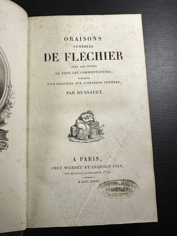 Paris, Werdet et Lequien fils, 1828.,Collection : Choix d'oraisons funèbres,IN8 plein veau plats estampés,dos lisse orné,2 p. l., lxiv, 343 p., 1 Discours préliminaires sur l'oraison funèbre par Joseph Dussault