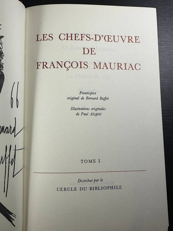 éditions Edito-Service, Cercle du Bibliophile 1970 Complet du volume 1 de la collection les chefs-d’oeuvre de François Mauriac. In-8 reliure éditeur rouge. Dos lisse avec titre, tomaison et fers dorés, premier plat avec encadrement de roulette dorée. Tête dorée. 22 cm sur 14. 443 pages. Frontispice “François Mauriac” par Bernard Buffet. Illustrations en noir et blanc hors-texte. Lettrines. Bon état d’occasion.