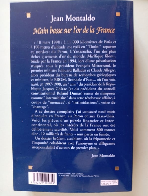 Albin michel 1998 414 pages in8. 1998. Broché. 414 pages. Absolument Neuf 18 mars 1998 : à 11 000 kilomètres de Paris et 4 100 mètres d'altitude me voilà en Tintin reporter au nord-est du Pérou à Yanacocha l'un des plus riches gisements d'or du monde.Mirifique Filon... bradé par la France en 1994 lors d'une privatisation truquée sous le président François Mitterrand le premier ministre Edouard Balladur et Claude Allègre alors président du bureau de recherches géologiques et minières le BRGM. Scandale d'Etat... où l'on voit aussi en 1997-1998 un ami du président de la République Jacques Chirac (et du président du conseil constitutionnel Roland Dumas) tenter de s'imposer comme intermédiaire dans cette ténébreuse affaire à Coups de menaces d'intimidations voire de chantage.A ce dossier exemplaire j'ai consacré neuf mois d'enquête en France au Pérou et aux Etats-Unis. Voici les pièces d'un puzzle financier et intercontinental où les intérêts de la France ont été délibérément sacrifiés. Voici comment 800 tonnes d'or - 12 milliards de francs - sont partis en fumée. Un dossier brûlant accablant où la friponnerie et l'impunité cohabitent avec l'anonyme et affligeante irresponsabilité d'acteurs de premier plan. Jean Montaldo
