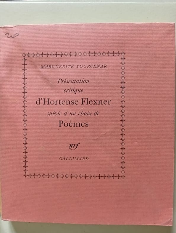 Paris, Gallimard, 1979, 1 vol. in-8° carré (19,6 x 17 cm) de 119 p. suivies d'une liste des oeuvres de Marguerite Yourcenar. Collection NRF, édition bilingue français-américain, traduit de l'américain par M. Yourcenar. Achevé d'imprimer le 7 septembre 1979 à Mayenne. Hortense Flexner (1885-1973) : poétesse américaine. Marguerite Yourcenar (1903-1987) : romancière, essayiste et poétesse. Membre de l'Institut et de l'Académie française.