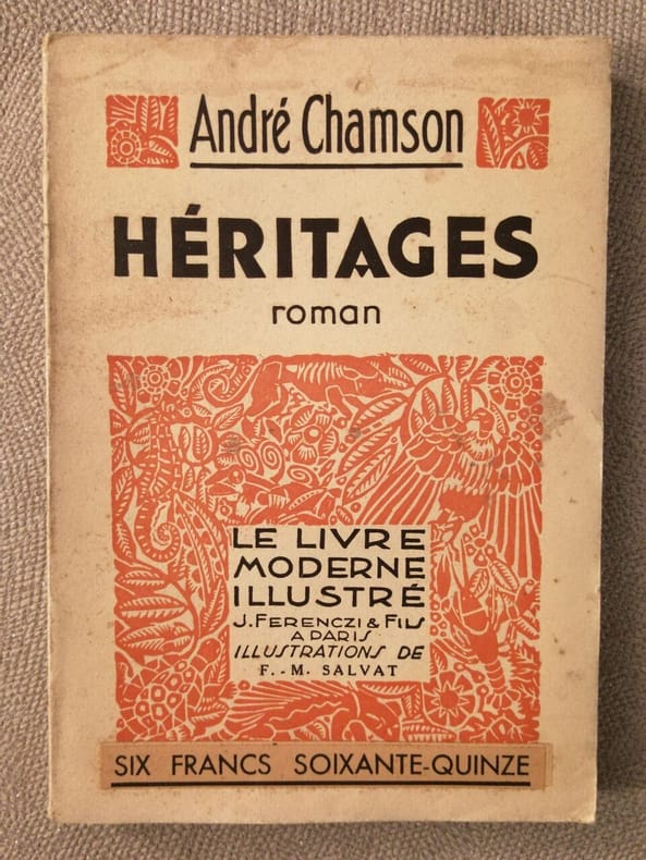 Titre : Héritages Auteur : Chamson André Éditeur : J. Ferenczi et Fils Collection : Le Livre Moderne Illustré Lieu d'édition : Paris Date : 1934 Illustrateur : F.-M. Salvat Langue : Français Reliure : Broché, couverture imprimée d'origine, sans jaquette (comme paru) Format : in-12 - env. 19 x 12,5 cm Etat : Bon état d'ensemble - couverture avec petites usures et froissements aux bords et aux coins, dos légèrement ridé, infimes déchirures marginales, papier uniformément jauni, intérieur propre et solidement relié Description : Roman d'André Chamson dans la collection Le Livre Moderne Illustré, orné de nombreuses illustrations en couleurs et en noir par F.-M. Salvat (planches et vignettes). Achevé d'imprimer sur les presses de l'Imprimerie Moderne, 177 route de Châtillon, à Montrouge, le 12 novembre 1934. Papier de luxe, impression soignée ISBN : Non précisé Provenance ou particularités : Prix d'éditeur d'époque mentionné au 1er plat (4,50 F)
