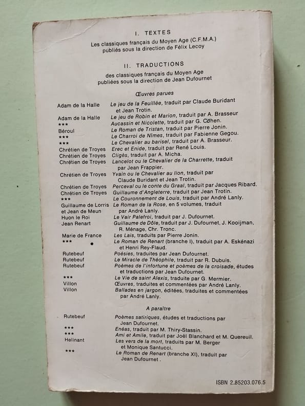 Paris, Champion, 1983. In-8 broché, 256 pages, traduit en Français moderne par Emmanuele Baumgartner. Titre décoloré sur le dos, sinon très bon état.