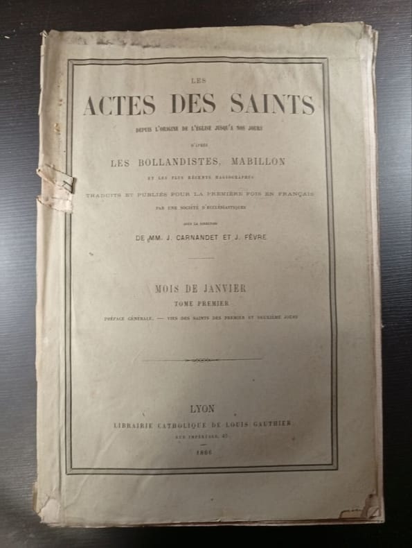 LIBRAIRIE CATHOLIQUE DE LOUIS GAUTHIER. 1866. In-4. Broché. Etat d'usage, Coins frottés, Coiffe en pied abîmée, Quelques rousseurs. 440 pages. Texte sur deux colonnes. Coiffe en pied abîmé, dos renforcé par du papier kraft. Coins déchîrés. Tampon sur la page de titre. Etiquette en coiffe en pied. Ouvrage de bibliotheque.. . . . Classification Dewey : 235-Les saints