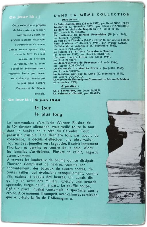 Ce jour-là: 6 juin 1944. L'histoire vue des deux cotés du débarquement en Normandie. La plus formidable opération de tous les temps pour l'audace de l'assaut mais également pour le déploiement logistique absolument exceptionnel. Un livre, paru initialement en 1963, qui allait créer une nouvelle forme d'aborder l'histoire - Le récit historique minutieux mais aussi très vivant - qui allait faire école. Ce livre a également été le support du scénario du film ˮLe jour le plus longˮ.