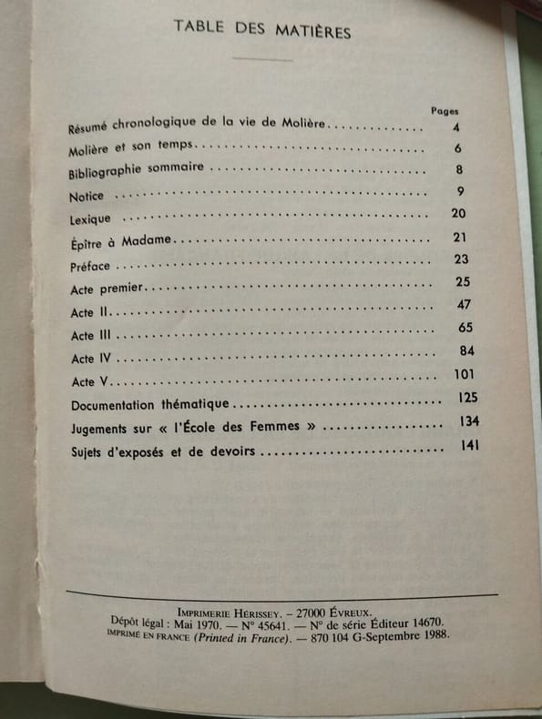 vie de moliere- l'etourdi - le depit amoureux- les precieuses ridicules- sganarelle- don garcie - l'ecole des maris, comedie en trois actes- l'ecole des femmes- l'impromptu de versailles- le mariage forcé- les facheux- la critique de l'ecole des femmes- la princesse d'elide- dom juan ou le festin de pierre- l'amour medecin - le misanthrope- le medecin malgres lui- melicerte- pastorale comique - le sicilien ou l'amour peintre- monsieur de pourceaugnac - les amants magnifiques- le bourgeois gentilhomme- les fourberies de scapin. Classification Dewey : 840.04-XVII ème siècle