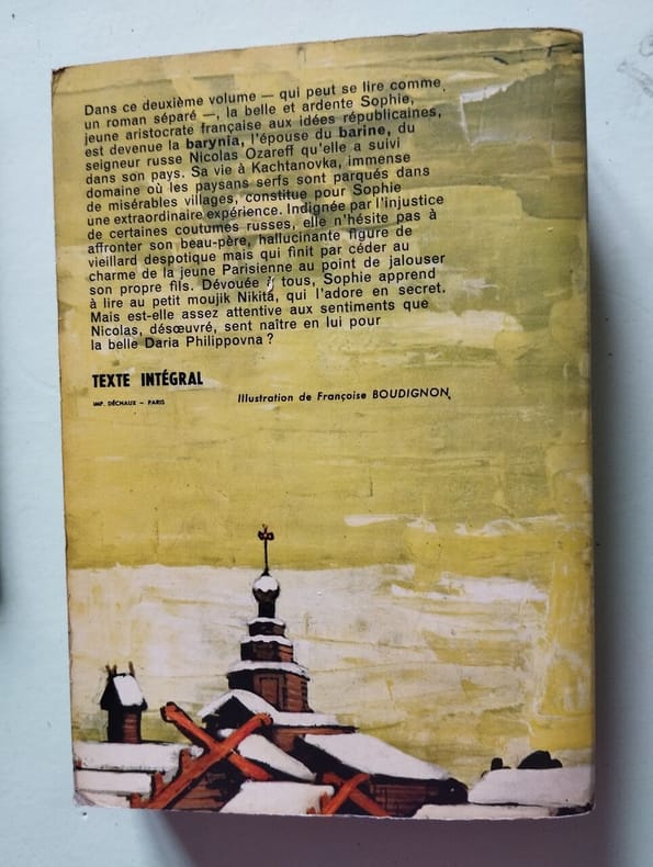 Dans ce deuxième volume - qui peut se lire comme un roman séparé-, la belle et ardente Sophie, jeune aristocrate française aux idées républicaines, est devenue la barynia, l'épouse du barine, du seigneur russe Nicolas Ozareff qu'elle a suivi dans son pays. Sa vie à Kachtanovka, immense domaine où les paysans serfs sont parqués dans de misérables villages, constitue pour Sophie une extraordinaire expérience. Indignée par l'injustice de certaines coutumes russes, elle n'hésite pas à affronter son beau-père, hallucinante figure de vieillard despotique mais qui finit par céder au charme de la jeune Parisienne au point de jalouser son propre fils. Dévouée à tous, Sophie apprend à lire au petit moujik Nikita, qui l'adore en secret. Mais est-elle assez attentive aux sentiments que Nicolas, désœuvré, sent naître en lui pour la belle Daria Philippovna ? Tome II, des oeuvres de. vol gd in8, 200x140, superbe reliure cuir, dos à nerfs, très bel état, 346pp Flammarion, 1960 d'autres vols de la même série en vente, groupez les achats ! ref/c108
