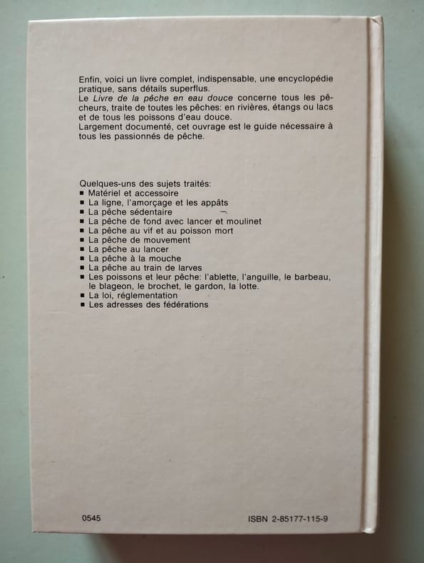 Encyclopédie pratique qui concerne tous les pêcheurs, traite de toutes les pêches : en rivières, étangs ou lacs et de tous les poissons d’eau douce : matériel et accessoires, la ligne l’amorçage et les appâts, la pêche sédentaire, la pêche de fond avec lancer et moulinet, au vif et au poisson mort, la pêche de mouvement, au lancer, à la mouche, au train de larves, les poissons et leur pêche : ablette, anguille, barbeau, blageon, brochet, gardon, lotte ; la loi règlementation, adresses des fédérations.Gaidy p.421.
