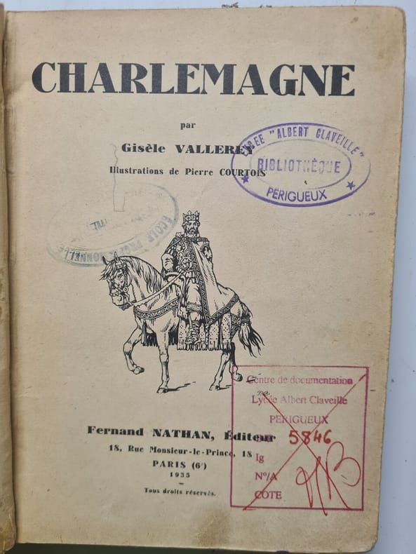 Introduction par LEON GAUTIER - 3 planches depliantes: VITRAIL DE CHARLEMAGNE + CARTE DE L'EMPIRE DE CHARLEMAGNE APRES LE PARTAGE DE 806 DRESSEE PAR AUGUSTE LOXGNON (1876) + CONFIRMATION PAR CHARLEMAGNE D'UNE VENTE DU COMTE HRODHARD A L'ABBAYE DE SAINT-DENIS. Classification Dewey : 944-Histoire de France varia