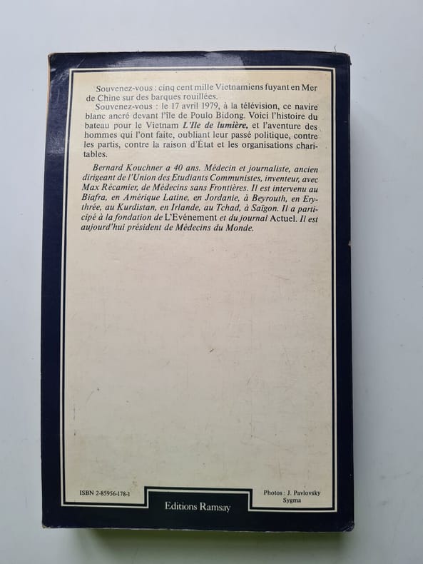 L’opération « un bateau pour le Vietnam », opération de sauvetage des boat people en Mer de Chine sur le bateau “L'Île de lumière”. — Souvenez-vous : cinq cent mille Vietnamiens fuyant en Mer de Chine sur des barques rouillées. Souvenez-vous : le 17 avril 1979, à la télévision, ce navire blanc ancré devant l'île de Poulo Bidong. Voici l'histoire du bateau pour le Viêt Nam “L'Île de lumière”, et l'aventure des hommes qui l'ont faite, oubliant leur passé politique, contre les partis, contre la raison d'État et les organisations charitables.