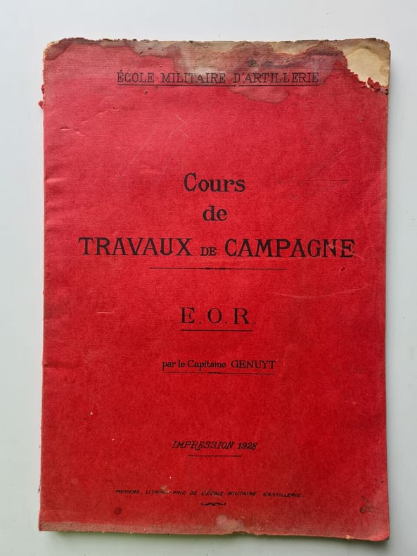 1 vol. grand in-4 reliure demi-basane rouge, Cours d'Art Militaire. Ecole Polytechnique Instruction Militaire. Année 1913-1914 : Génie. Travaux de Campagne. 2 Conférences. Août 1913, 89 pp. [ Capitaine Piquet ] - Aéronautique. Août 1913, 69 pp. [Capitaine Barré ] - Administration. 2 Conférences. Novembre 1913 [ Capitaine Pesseaud ], 43 pp. - Service des Armées en Campagne. 2 Conférences, Novembre 1913, 43 pp. [ Capitaine Morellet ] - Cours d'Artillerie. 3e Partie 3 Conférences, Août 1913, 28-29-42 pp. [ Capitaine Morellet ] - L'Officier dans la Nation Armée. Décembre 1913, 55 pp. [ Capitaine Cattin ] - Conférence d'Education Physique. Avril 1914, 20 pp. [ Capitaine Menjaud ] - Conférences à l'Ecole Polytechnique destinées à mettre en évidence les relations qui existent entre la théorie et les application, 14-30-19-19-29-40 pp. [ Sur les Sous-Marins, avec 2 grandes planches dépliantes ] et 8 planches puis 11 planches dépliantes [ Soit pour l'ensemble de l'ouvrage 21 planches dépliantes ]