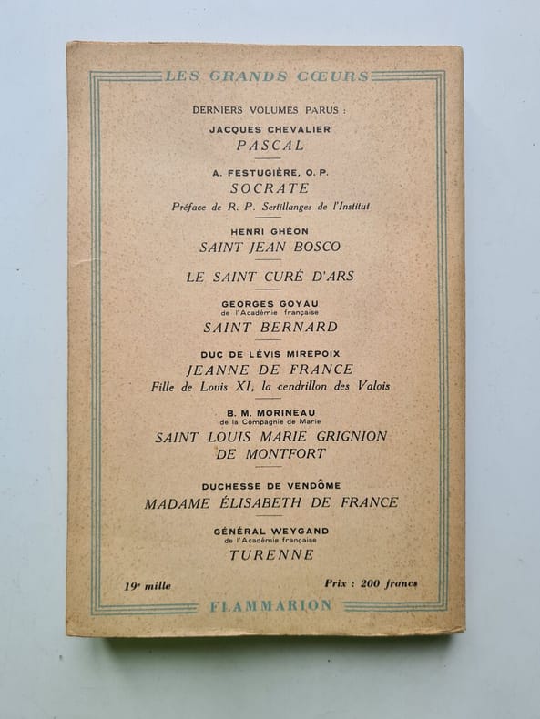 16 planches hors-texte d'illustrations en noir (complet) édition de 1970 Contents, Chapitres : Les origines - Citeaux, la discipline ascétique - Bernard et la papauté - Bernard devant l'esprit critique et devant l'hérésie - Bernard à Clairvaux, les sermons, leur mystique - Bernard et le pouvoir civil - Les perspectives lévantines - Bernard de la Terre Sainte avant le sermon de Vezelay - Le lancement de la Seconde croisade - Art oratoire et littéraire - Les croisés à l'épreuve - Bernard et Eugène III, Le Traité de Considération - Les dernières années - La mort, la survie - Epilogue : Le culte marial - Bibliographie sommaire - Bernard de Fontaine, abbé de Clairvaux, né en 1090 à Fontaine-lès-Dijon et mort le 20 août 1153 à l'abbaye de Clairvaux, est un moine bourguignon, réformateur de la vie religieuse catholique. Directeur de conscience et important promoteur de l'ordre cistercien (ou ordre de Cîteaux), il recherche l'amour du Christ par la mortification la plus dure. Bernard de Fontaine fait preuve, toute sa vie, d'une activité inlassable pour instruire ses moines de Clairvaux, pour émouvoir et entraîner les foules, pour allier son ordre avec la papauté et pour élaborer un dogme militant que son ordre et toute l'Église catholique mettront en uvre. C'est aussi un conservateur, qui fustige les mutations de son époque (la « Renaissance du xiie siècle »), marquée par une profonde transformation de l'économie, de la société et du pouvoir politique. Mort en 1153, il est canonisé dès 1174 et devient ainsi saint Bernard de Clairvaux. Il est déclaré Docteur de l'Église catholique en 1830 par le pape Pie VIII. (source : Wikipedia) bon exemplaire, frais et propre, bien complet des 16 planches hors-texte