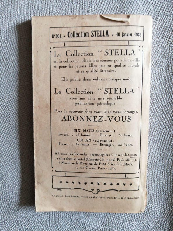 Petit Echo de la Mode Collection Stella N°308. 1933. In-12. Broché. Etat passable, Couv. défraîchie, Dos abîmé, Quelques rousseurs. 160 pages, premier plat de couverture illustré en couleurs par MC. Plats désolidarisés - manques au dos. Agrafes rouillées.. . . . Classification Dewey : 840-Littératures des langues romanes. Littérature française
