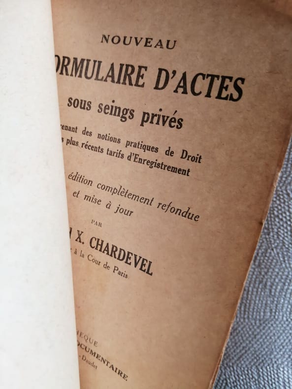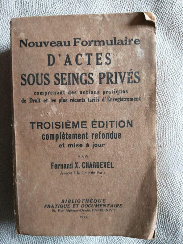 Bibliothèque des ouvrages pratiques Cartonnage d'éditeur 1932 "In-12° cartonnage d'éditeur, 1318 pp. suivies de deux bons de commande, ""supplément au nouveau formulaire d'actes usuels et sous-seings privés"" de 1933 inséré dans le volume ; dos insolé, coins et coiffes légèrement abimés, bon état général Livraison a domicile (La Poste) ou en Mondial Relay sur simple demande."