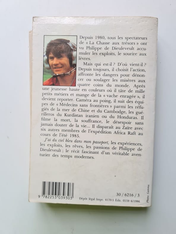 Grasset et Fasquelle 1984 in8. 1984. broché. 292 pages. De son hélicoptère il saute sur un bateau ou sur un toit plonge à trente mètres sous l'eau tombe en chute libre pendant mille sept cents mètres traverse une rivière à la nage pour nourrir un éléphant ou grimpe sur un arbre pour serrer la main d'un singe un peu timide. Depuis 1980 tous les spectateurs de {la Chasse aux trésors} ont vu Philippe de Dieuleveult accumuler les exploits le sourire aux lèvres. Mais qui est-il ? D'où vient-il ? Depuis toujours il a choisi l'action et affronté les dangers. Après une jeunesse haute en couleurs où il a tâté de mille petits métiers et mangé de la 'vache enragée' il est devenu reporter. Caméra au poing il a suivi des équipes de Médecins sans Frontières parmi les réfugiés de la mer de Chine et du Cambodge les guérilleros du Kurdistan iranien ou du Honduras. Il a filmé la mort la souffrance le désespoir sans jamais douter de la vie. Ses expériences ses rêves ses passions aujourd'hui il a décidé de tout raconter dans ce récit passionnant d'un véritable aventurier des temps modernes Bon Etat