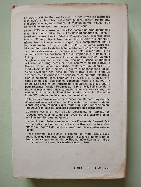 "Le malheur de Louis XVI fut d'accéder au trône à une époque où il était impossible de l'occuper sans faire exactement l'inverse de ce que réclamaient les Français, tant il est vrai que ce que le peuple demande est rarement ce qu'il veut. Les Français étaient grisés du mot de " liberté", mais chaque liberté réelle que Louis XVI leur accordait cessait de leur plaire dès qu'ils en jouissaient et le joug, dont ils avaient tout loisir de se plaindre, leur devenait d'autant plus intolérable qu'il s'allégeait. "Sous ses prédécesseurs", remarquait Soulavie, un de ses sujets tardivement repentis, "le monarque était l'objet du culte des Français ; sous Louis XVI, les Français devinrent l'objet du culte du monarque." Ainsi l'amour, en changeant de camp, avait-il préludé au divorce entre le Roi et la nation. "Livre de justice et de réparation", écrivit Bernard Faÿ lorsque, voilà plus de vingt ans, il me dédicaça un exemplaire de Louis XVI ou la fin d'un monde que les Editions de la Table ronde ont l'excellente idée de rééditer. La modestie de Bernard Faÿ l'empêchait d'ajouter : "le meilleur livre sur Louis XVI". Il m'appartient de le dire aujourd'hui." (Ghislain de Diesbach, préface)