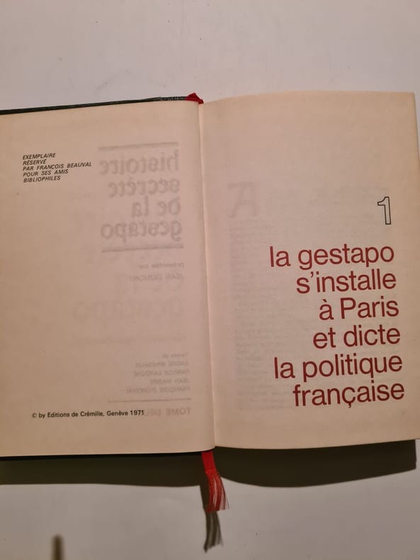 Paris, Fayard, coll. « Les grandes études contemporaines », (6 décembre) 1962 1 vol. (135 x 220 mm) de 472 pp., [3] et 1 ff. Broché. Édition originale. Exemplaire poinçonné du service de presse. Envoi à Jean Desborde, journaliste à Vichy (où travaille Delarue) : « Pour Monsieur Jean Desborde,/cette /Histoire de la Gestapo (ici le titre)/, en hommage respectueux/de l'auteur/Delarue ».