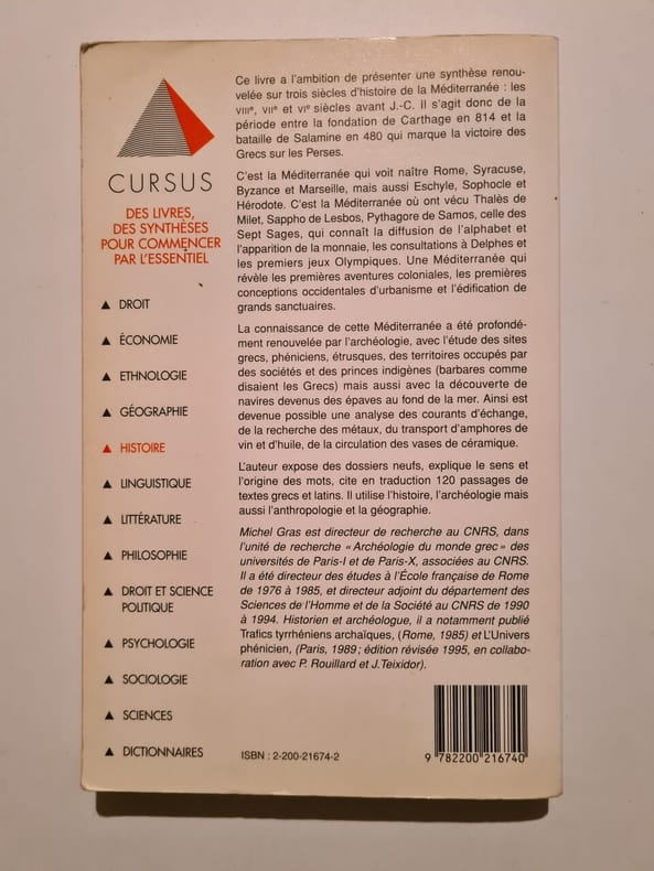 Ce livre a l'ambition de présenter une synthèse renouvelée sur trois siècles d'histoire de la Méditerranée : les VIIIe, VIIe et VIe siècles avant J.-C. Il s'agit donc de la période entre la fondation de Carthage en 814 et la bataille de Salamine en 480 qui marque la victoire des Grecs sur les Perses. C'est la Méditérranée qui voit naître Rome, Syracuse, Byzance et Marseille, mais aussi Eschyle, Sophocle et Hérodote. C'est la Méditerranée où ont vécu Thalès de Milet, Sappho de Lesbos, Pythagore de Samos, celle des Sept Sages, qui connaît la diffusion de l'alphabet et l'apparition de la monnaie, les consultations à Delphes et les premiers jeux Olympiques. Une Méditerranée qui révèle les premières aventures coloniales, les premières conceptions occidentales d'urbanisme et d'édification de grands sanctuaires. La connaissance de cette Méditerranée a été profondément renouvelée par l'archéologie, avec l'étude des sites grecs, phéniciens, étrusques, des territoires occupés par des sociétés et des princes indigènes (barbares comme disaient les Grecs) mais aussi avec la découverte de navires devenus des épaves au fond de la mer. Ainsi est devenue possible une analyse des courants d'échange, de la recherche des métaux, du transport d'amphores de vin et d'huile, de la circulation des vases de céramique. L'auteur expose des dossiers neufs, explique le sens et l'origine des mots, cite en traduction 120 passages de textes grecs et latins. Il utilise l'histoire, l'archéologie mais aussi l'anthropologie et la géographie.