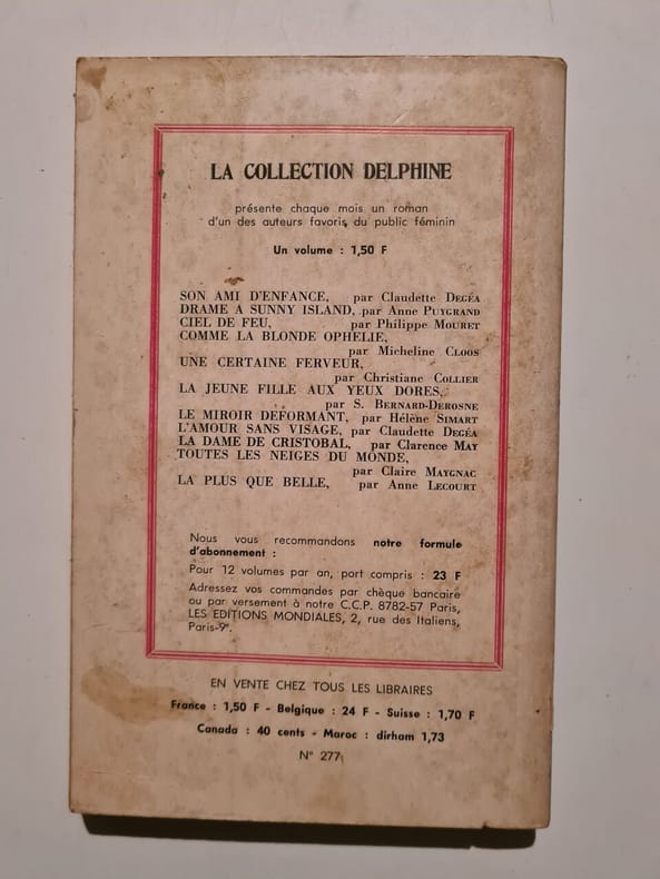 LES EDITIONS MONDIALES / COLLECTION DELPHINE N°277. 1969. In-12. Broché. Etat d'usage, Couv. convenable, Dos frotté, Quelques rousseurs. 143 pages. Tampon en page de titre.. . . . Classification Dewey : 840.091-XX ème siècle