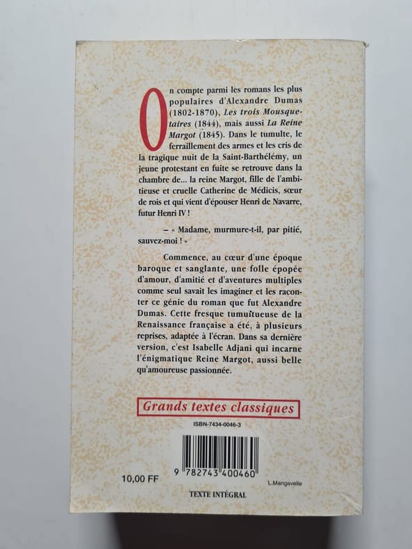 Alexandre Dumas. La reine Margot 1572. La France des guerres de religion est devenue le champ clos des grands seigneurs et des prétendants au trône. A Paris, le jeune roi protestant de Navarre, le futur Henri IV, vient d'épouser Marguerite de Valois, dite Margot; mariage politique qui n'empêche pas les Guise et le roi Charles IX de fomenter les horreurs de la Saint-Barthélemy. Sur les pas du jeune comte de La Mole, dont s'éprend éperdument la belle Margot, et de son compagnon, le tonitruant Annibal de Coconnas, nous entrons dans ce labyrinthe d'intrigues, d'alliances, de trahisons. Les poignards luisent sous les pourpoints. René le Florentin fournit les poisons à l'implacable Catherine de Médicis. Le vieux Louvre avec ses fêtes brillantes, ses passages secrets, son peuple de soldats et de jolies femmes, est le théâtre où se déploient en mille péripéties les jeux de l'amour, de la politique, de la haine. Le père des Trois Mousquetaires nous en donne une passionnante chronique, où sa pétulante bonne humeur survit aux plus sanglants épisodes.