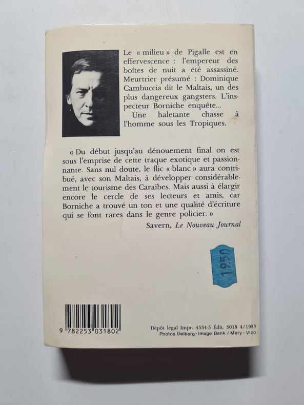 Grasset et fasquelle 1981 in-8. 1981. Broché. 366 pages. Le Milieu corse de Pigalle est en effervescence : l'empereur des boîtes de nuit de Paris vient d'être assassiné. Meurtrier présumé : Dominique Cambuccia dit le Maltais l'organisateur des hold-up et des cambriolages les plus astucieux et les plus audacieux de son temps. L'inspecteur Roger Borniche enquête. Une longue traque le mène jusqu'aux Caraïbes. Plages de sable fin bordées de cocotiers combats de coqs et mystères vaudous : derrière ce décor de rêve le Maltais pousse ses pions sur l'échiquier du crime. Une chasse à l'homme sous les Tropiques Bon Etat