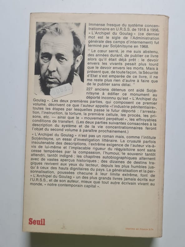 Seuil Sans date. L'Archipel du Goulag est une œuvre majeure d'Alexandre Soljenitsyne qui retrace l'histoire du système concentrationnaire soviétique de 1918 à 1956 basée sur son expérience personnelle et une enquête minutieuse. Ce récit qui a circulé clandestinement en URSS et connu un retentissement international dépeint la souffrance et la résilience des prisonniers tout en ébranlant les fondements de l'idéologie communiste