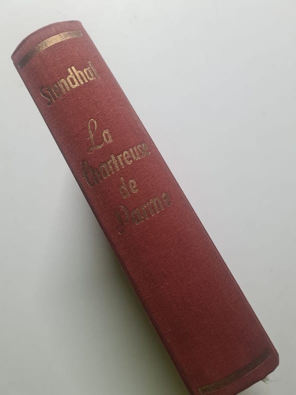 2 volumes in-8 (19 cm x 12,5 cm), demi-maroquin brun à coins (reliure de l'époque), dos à nerfs orné de filets dorés et de cercles noirs, tête dorée, couverture et dos conservés, feuillets bleus. vii-[1]-362-[3]-1 bl. ; 444-[1]-1 bl. pages (complet). Bon état. Nouvelle édition revue sur l’édition originale, illustrée de 2 frontispices, de Maurice de Becque, gravés sur bois par G. Aubert. Tirage à 1975 exemplaires, celui-ci 1/75 sur vélin de rives bleu lavande, (n°59), ici ENRICHI d'un état supplémentaire des frontispices. Roman le plus célèbre de Stendhal, La Chartreuse de Parme mélange des événements historiques réels avec une Italie fantasmée. De Waterloo à Parme, Stendhal dépeint les aventures du jeune Fabrice del Dongo, héros romantique pris dans la trame de l’Histoire puis prisonnier de son amour pour Clélia Conti, qui le pousse à se retirer dans une chartreuse. Cette histoire dramatique où presque tous les personnages disparaissent après avoir connu un destin tragique est aussi un livre politique, visant aussi bien la société française que la politique italienne de l’époque. Agréable exemplaire.