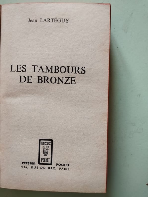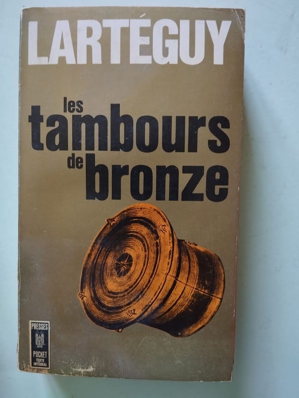 Les Tambours de Bronze hard cover , reliure jaune pâle avec imprimé rouge et jaquette 180 x 120 mm, 345 pg, en bon etat