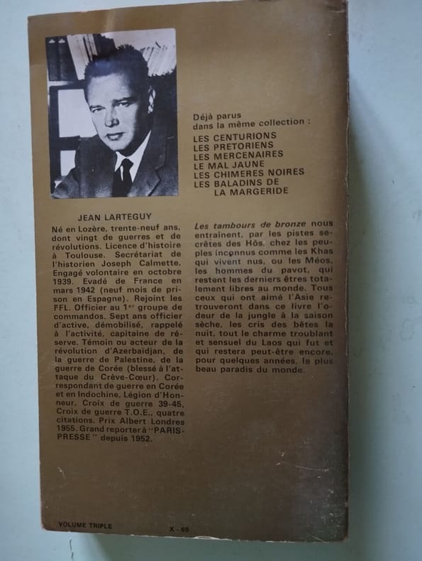 1965 LARTEGUY Jean : Les tambours de bronze. Presse de la Cité Paris 1965. E.O. L’un des 100 ex. sur Vélin, seul grand papier. En feuilles in-8 sous chemise et papier plein papier jaune. Dos avec petites traces sinon très bel état pour ce grand roman sur les Moïs et Karen du Laos, de la Birmanie et du Tonkin