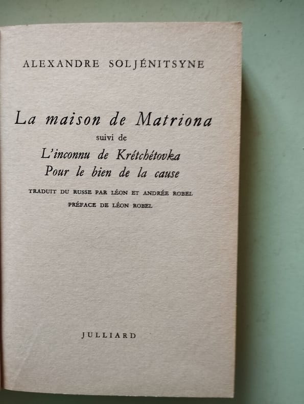 Récit trad. du russe par Léon et ANdrée Robel et Maurice Decaillot. Préface de Pierre daix. Suivi de La Maison de Matriona, L'Inconnu de Kretchetovska et Pour le bien de la cause, tard. par Léon et Andrée Robel. Préface de Léon Robel. Classification Dewey : 891.7-Littérature russe (slave)