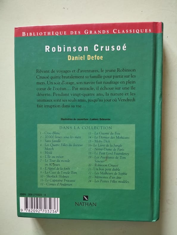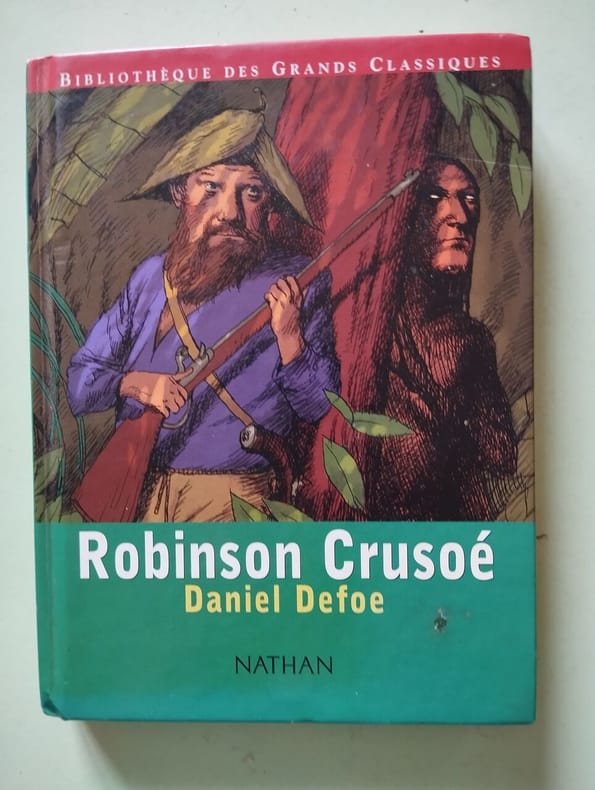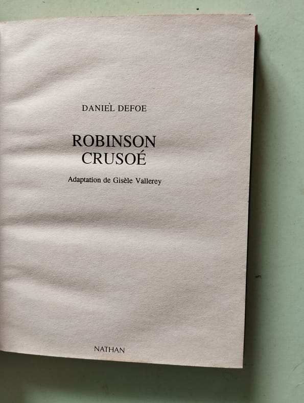 Titre : Vie et aventures de Robinson Crusoé Auteur : Defoe Daniel Éditeur : Librairie Hachette et Cie Lieu : Paris Date : 1874 Format : in-12, env. 18 x 12 cm Reliure : Cartonnage éditeur, dos toilé vert titré or, plats imprimés encadrés, mention « Prix 2 f » et cachet imprimé « Offert par les éditeurs » État : Frottements d’usage aux coins et aux coiffes, petite fente en tête du dos, papier légèrement bruni avec rousseurs éparses, intérieur solide Langue : Anglais avec notes en français Description : Nouvelle édition scolaire de Robinson Crusoe publiée avec une notice, un argument analytique et des notes en français par Alexandre Beljame. Page de titre datée 1874, impression Lahure (Rue de Fleurus). Texte principal en anglais, abondantes notes explicatives et vocabulaire en français pour l’étude. Bel exemplaire au cartonnage Hachette d’origine, typique des éditions pédagogiques du XIXe siècle.