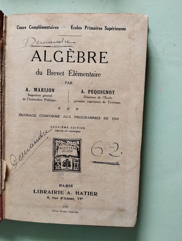 Algèbre du Brevet élémentaire par A. Marijon & P. Pequignot (1946) en bon état