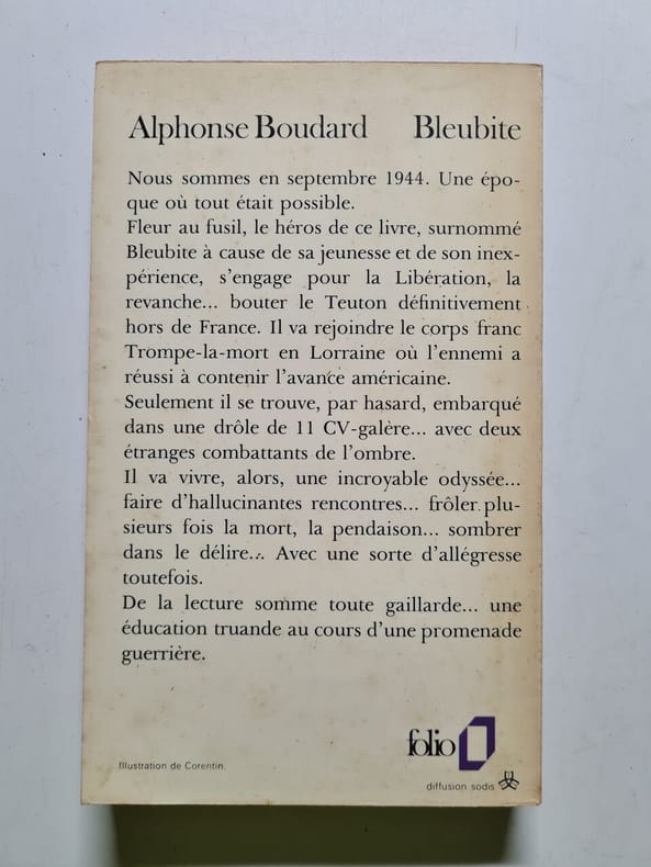 "Nous sommes en septembre 1944. Une époque où tout était possible. Fleur au fusil, le héros de ce livre, surnommé Bleubite à cause de sa jeunesse et de son inexpérience, s'engage pour la Libération, la revanche. bouter le Teuton définitivement hors de France. Il va rejoindre le corps franc Trompe-la-mort en Lorraine où l'ennemi a réussi à contenir l'avance américaine. Seulement il se trouve, par hasard, embarqué dans une drôle de 11 CV-galère. avec deux étranges combattants de l'ombre. Il va vivre, alors, une incroyable odyssée. faire d'hallucinantes rencontres. frôler plusieurs fois la mort, la pendaison. sombrer dans le délire. Avec une sorte d'allégresse toutefois. De la lecture somme toute gaillarde. une éducation truande au cours d'une promenade guerrière. "