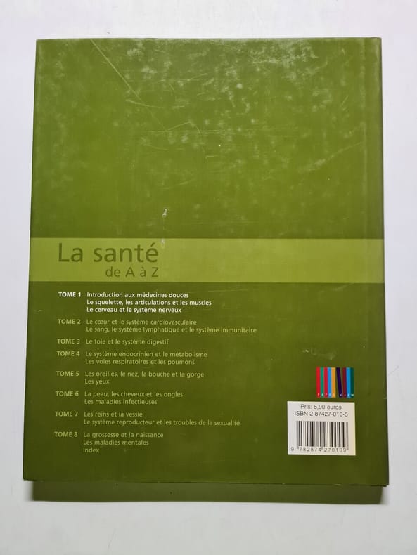 8 volumes. Tome 1 : Introduction aux médecines douces - Le squelette, les articulations et les muscles - Le cerveau et le système nerveux - Cancer et médecines douces : le point. Tome 2 : Le coeur et le système cardiovasculaire - Le sang, le système lymphatique et le système immunitaire. Tome 3 : Le foie et le système digestif. Tome 4 : Le système endocrinien et le métabolisme - Les voies respiratoires et les poumons. Tome 5 : Les oreilles, le nez, la bouche et la gorge - Les yeux. Tome 6 : La peau, les cheveux et les ongles - Les maladies infectieuses. Tome 7 : Les reins et la vessie - Le système reproducteur et les troubles de la sexualité. Tome 8 : La grossesse et la naissance - Les maladies mentales. Classification Dewey : 614-Santé publique, médecine préventive