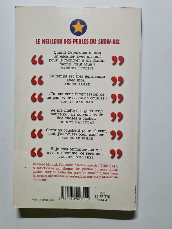 Quand Depardieu monte un escalier avec un oeuf pour le montrer à un gamin, même l'oeuf joue ! FABRICE LUCHINI Le temps est très gentleman avec moi... ANOUK AIMEE J'ai souvent l'impression de ne pas avoir assez de couilles ! SOPHIE MARCEAU Je me méfie des gens trop heureux : ils doivent avoir des choses à cacher. JOHNNY HALLYDAY Certains couchent pour réussir, moi, j'ai réussi pour coucher. SAMUEL LE BIHAN Si je dois terminer ma vie avec un homme, ce sera moi ! JACQUES VILLERET Classification Dewey : 791.432-Artistes