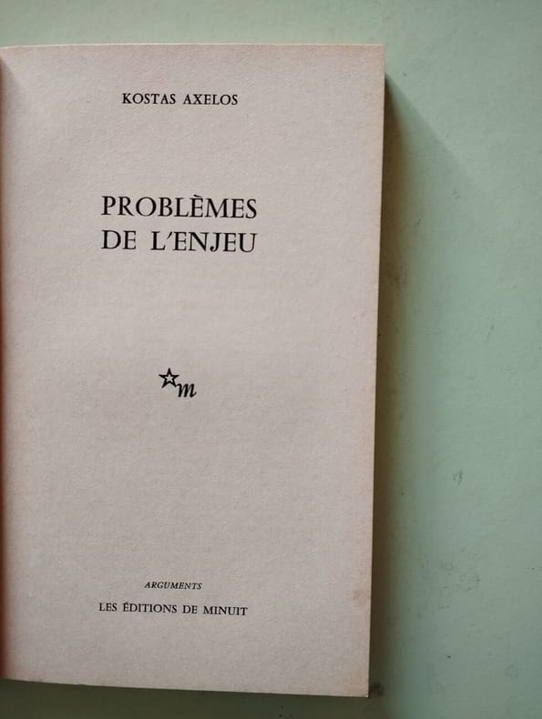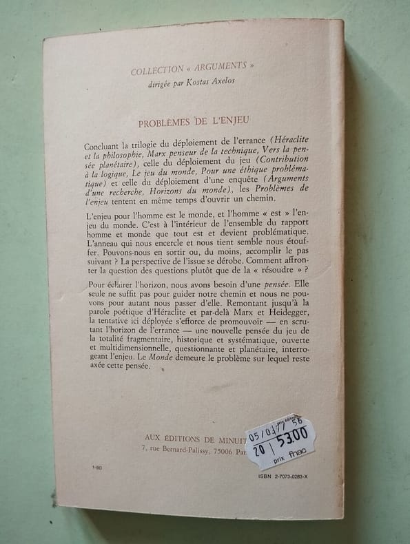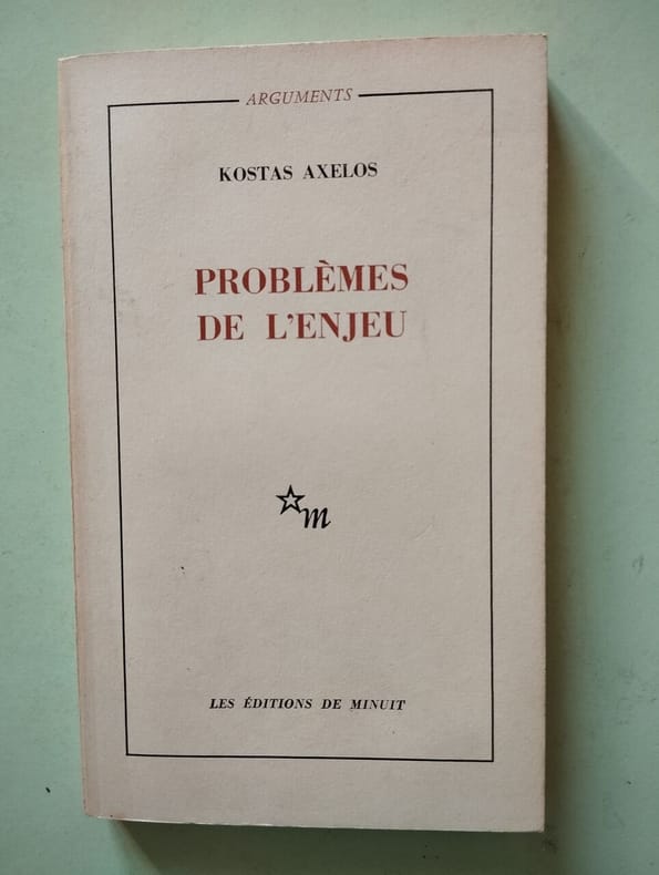 1ere édition Contents, Chapitres : Entrée en jeu - Ce qui nous concerne - L'enjeu - Science opérante et pensée questionnante - Le problème de la folie - La ville-problème - Le pas suivant - Issue ? - Précisions éditoriales - Kostas Axelos, né à Athènes le 26 juin 1924, mort le 4 février 2010, est un philosophe et traducteur français d'origine grecque. Professeur à la Sorbonne, spécialiste d'Héraclite, influencé par Platon, Hegel, Marx, Nietzsche et Heidegger, mais aussi Rimbaud, Hölderlin ou Mallarmé, il a rejoint en 1957 puis dirigé à partir de 1958 la revue Arguments à laquelle participaient notamment Edgar Morin et Jean Duvignaud, avant de fonder et diriger en 1960, aux Éditions de Minuit,la collection du même nom, qui fit découvrir en France certains des plus importants penseurs de l'époque, comme Eugen Fink, Herbert Marcuse, Rudolf Hilferding, Karl Korsch, permit la redécouverte de marxistes hétérodoxes comme Georg Lukacs, et accueillit aussi des auteurs comme Georges Bataille, Maurice Blanchot ou Jaspers. Il a publié une vingtaine de livres, la plupart en français mais aussi en grec et en allemand. Ses uvres ont été traduites en 16 langues. Il développe et reprend les grands concepts qui organisent sa pensée : le temps, le monde, le jeu. (source : Wikipedia) infime dechirure sans manque au bas du plat supérieur de la couverture, sinon tres bon état, intérieur propre, papier à peine jauni