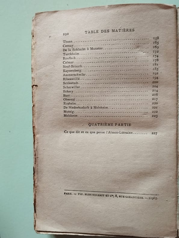 Le sens géographique de la Question d'Alsace-Lorraine ; Le sens historique de la Question d'Alsace-Lorraine ; Le sens juridique et politique de la Question d'Alsace-Lorraine. "C'est en étudiant la véritable signification géographique et historique des deux provinces qu'on découvre le sens profond de la Question d'Alsace, et, par là-même, les sources organiques de l'irrédentisme alsacien-lorrain." (Jules Duhem, avant-propos)
